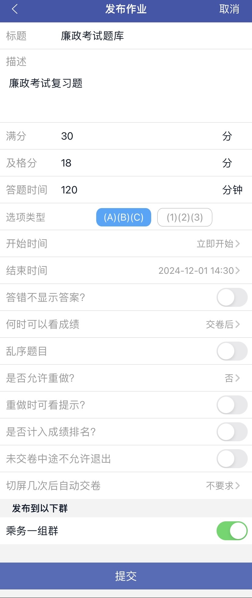 - "切屏几次后自动交卷": 如果不允许中途退出,设置允许切屏的次数,达到切屏次数上限将自动交卷。