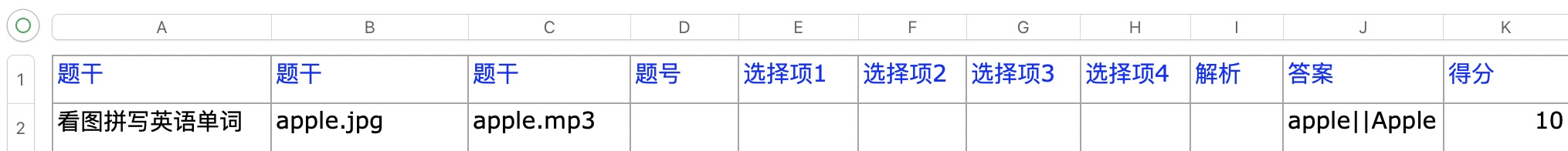 或者,您可以添加两个额外的“题干”列。在这些列中按顺序输入文字内容、图片文件名和音频文件名,如下所示: