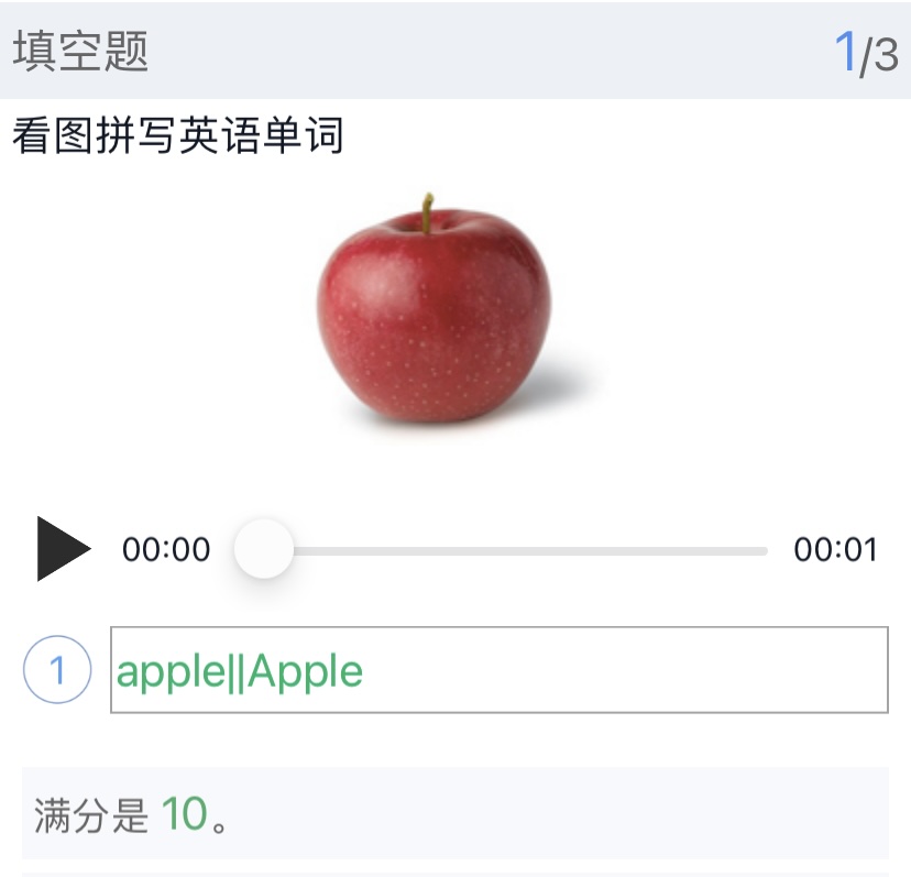最后,将Excel文件与其中引用的所有多媒体文件打包成一个ZIP文件。然后,将该ZIP文件导入到应用中。以下是该题目在应用中的显示效果: