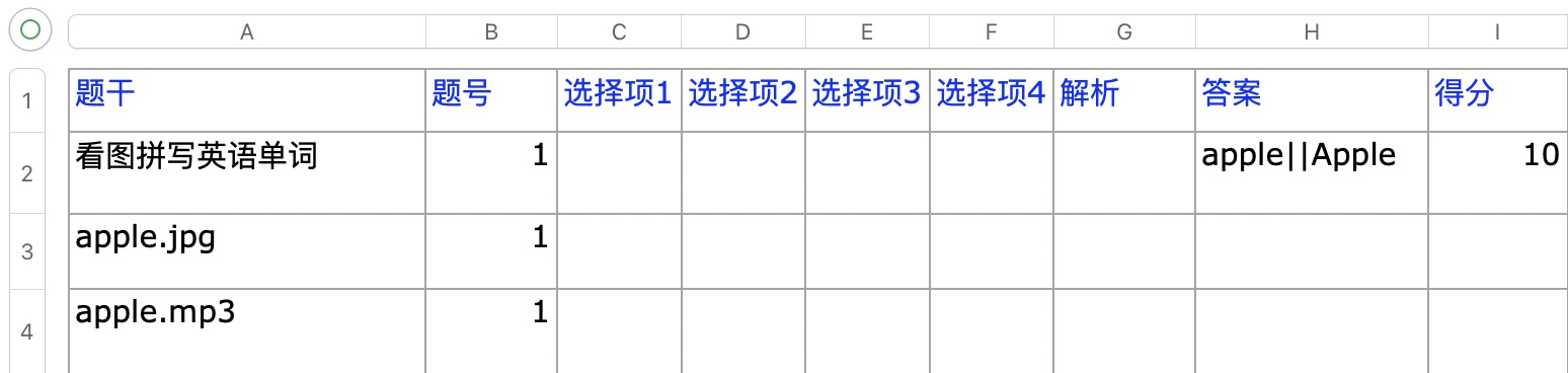 此题包含文字提示、图片和音频文件。在“题干”列中输入文字内容、图片文件名和音频文件名,并在“题号”列中为所有三行分配相同的题号,以表示它们属于同一题目,如下所示: