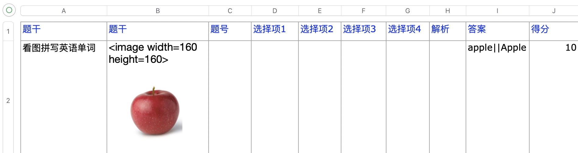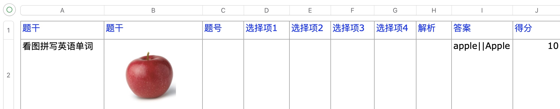 Excel文件(后缀是.xlsx)支持在文件中嵌入图片,把图片直接拖入Excel文件里,对于编制图文题来说比较直观。注意一个单元格里只能放入一张图片,图片不能横跨多个单元格。