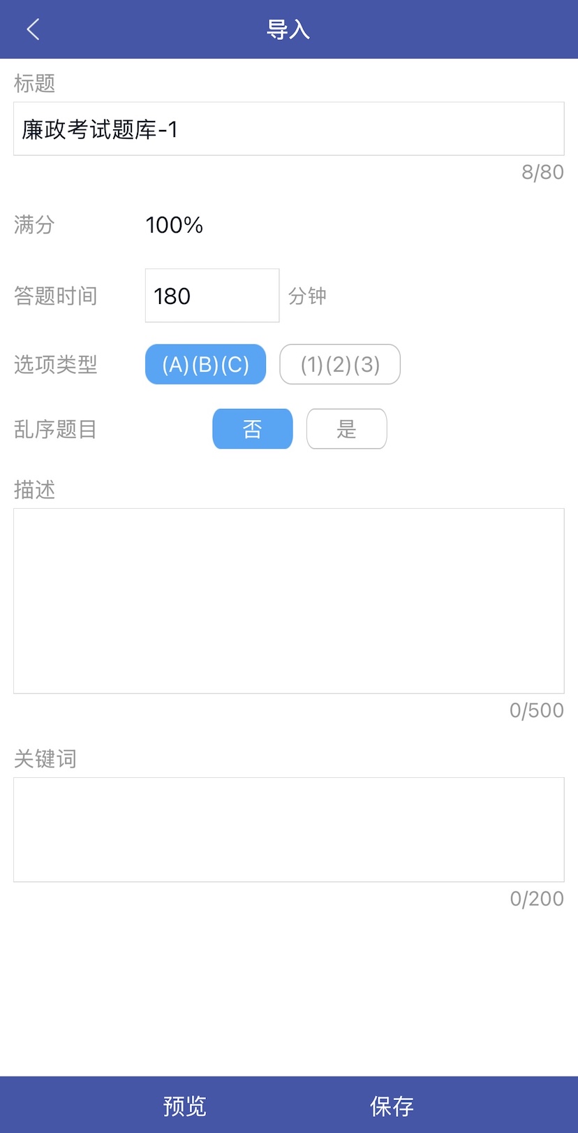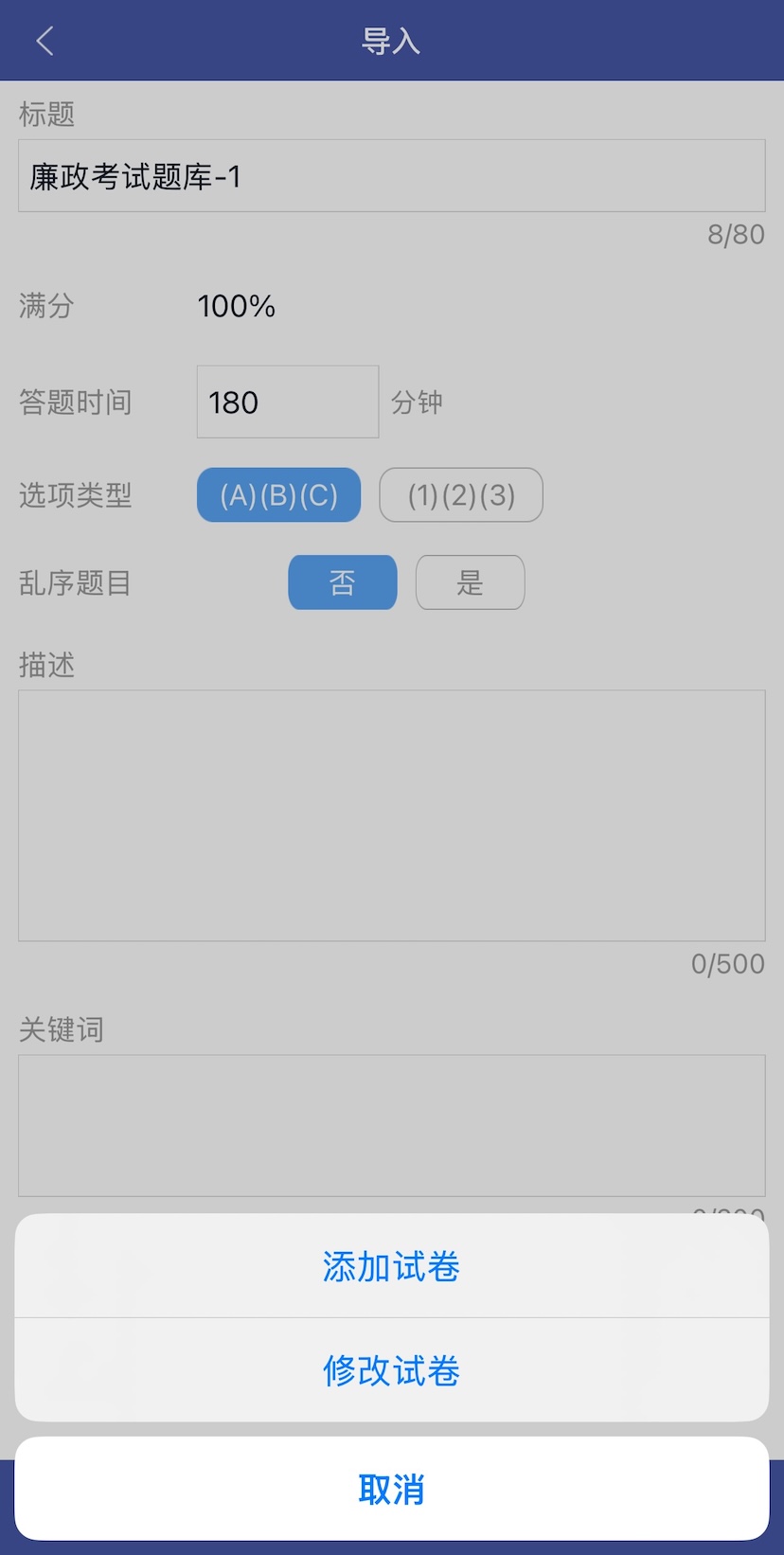 7. 修改试卷标题、答题时间、选项类型、描述、关键词等信息,然后点击【保存】按钮。